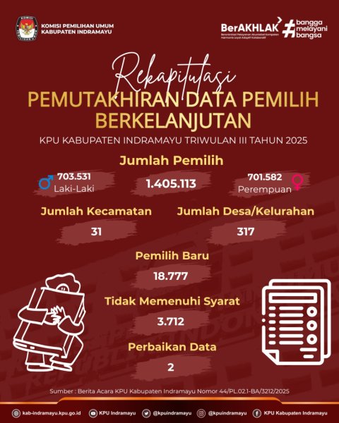 Hai #TemanPemilih, berikut kami sampaikan Rekapitulasi Pemutakhiran Data Pemilih Berkelanjutan (PDPB) oleh KPU Kabupaten Indramayu periode Triwulan III Tahun 2025.