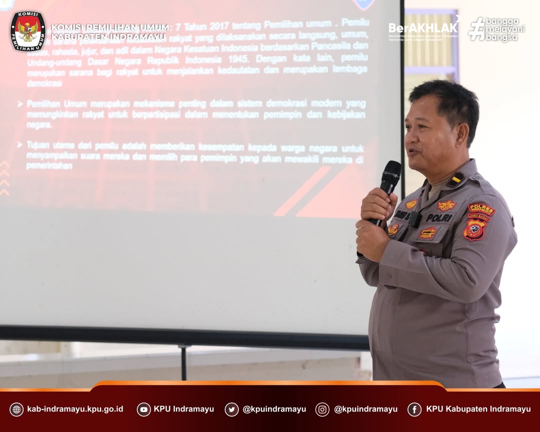 Kegiatan ini juga menghadirkan narasumber dari Polres Indramayu, Bapak Tasim, S.IP, yang memberikan materi terkait peran serta masyarakat dalam menjaga kondusivitas dan keamanan saat pemilu. Ia mengajak para siswa untuk ikut berkontribusi menciptakan pemilu yang aman, tertib, dan demokratis.