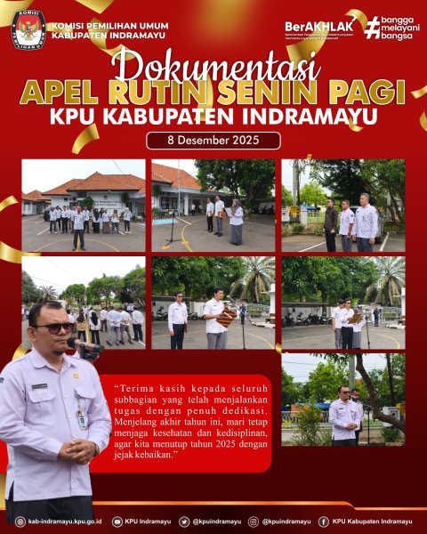 INDRAMAYU - KPU Kabupaten Indramayu kembali melaksanakan Apel Pagi Rutin pada Senin (8/12) pagi bertempat di halaman kantor KPU Indramayu. Kegiatan yang diikuti oleh seluruh jajaran sekretariat dan komisioner. ini dilaksanakan sebagai bentuk kedisiplinan sekaligus sarana koordinasi awal pekan.