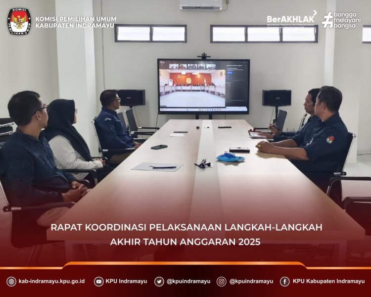 INDRAMAYU - Sekretariat Komisi Pemilihan Umum Kabupaten Indramayu mengikuti Rapat Koordinasi Pelaksanaan Langkah-Langkah Akhir Tahun Anggaran 2025, Selasa (23/12). Kegiatan tersebut diikuti oleh Sekretaris dan seluruh Kepala Subbagian sebagai bagian dari upaya penguatan koordinasi internal dalam menghadapi penutupan tahun anggaran.