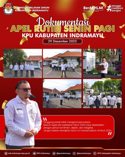 INDRAMAYU - KPU Kabupaten Indramayu kembali melaksanakan Apel Pagi Rutin bertempat di halaman Kantor KPU Kabupaten Indramayu, Senin (29/12). Kegiatan ini diikuti oleh seluruh jajaran sekretariat sebagai bagian dari upaya menegakkan kedisiplinan serta memperkuat koordinasi di awal pekan kerja.