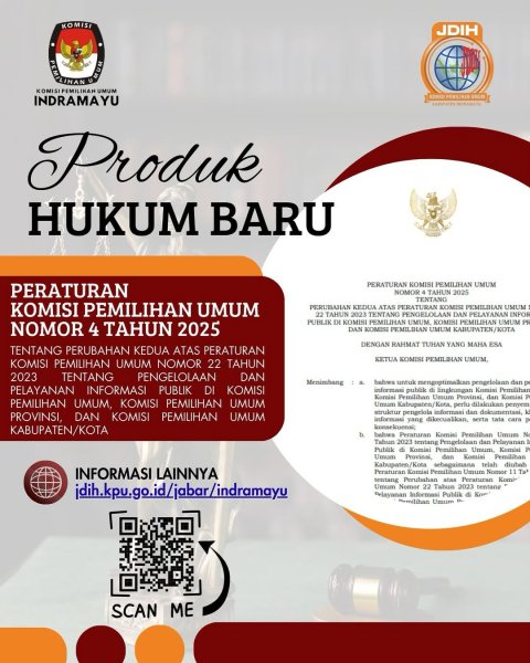 KPU RI telah menetapkan Peraturan Komisi Pemilihan Umum Nomor 4 Tahun 2025 tentang Perubahan Kedua atas Peraturan KPU Nomor 22 Tahun 2023 mengenai Pengelolaan dan Pelayanan Informasi Publik di lingkungan KPU, KPU Provinsi, dan KPU Kabupaten/Kota.
