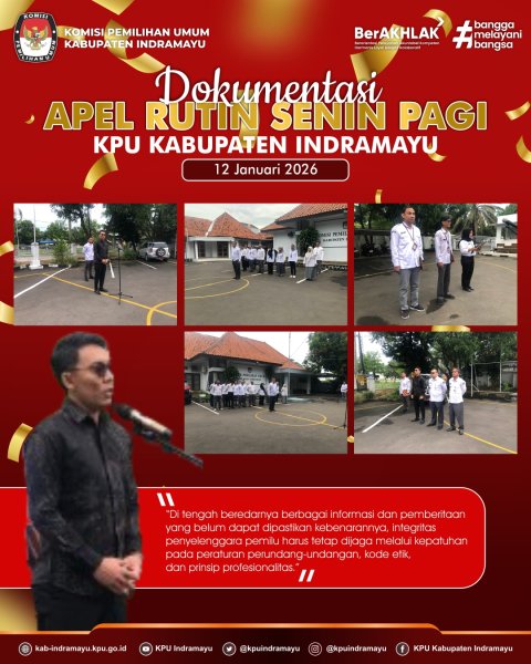 INDRAMAYU - KPU Kabupaten Indramayu kembali melaksanakan Apel Pagi Rutin yang bertempat di halaman Kantor KPU Kabupaten Indramayu, Senin (12/01). Kegiatan ini diikuti oleh seluruh jajaran Komisioner dan sekretariat sebagai bagian dari upaya menegakkan kedisiplinan serta memperkuat koordinasi di awal pekan kerja.