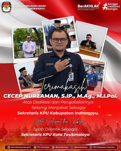 INDRAMAYU - KPU Kabupaten Indramayu mengucapkan Selamat dan sukses kepada Cecep Nurzaman atas jabatan barunya sebagai Sekretaris KPU Kota Tasikmalaya. Semoga kepercayaan yang diberikan dapat dijalankan dengan penuh tanggung jawab, integritas, dan dedikasi dalam mengemban tugas serta memberikan kontribusi terbaik bagi penyelenggaraan demokrasi.