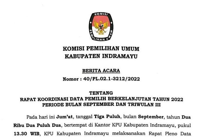 Berita Acara Data Pemilih Berkelanjutan Bulan September dan Triwulan III berdasarkan hasil Rapat Pleno Data Pemilih Berkelanjutan Tahun 2022 Periode Bulan September dan Triwulan III di tingkat Kabupaten pada 30 Septemeber 2022.