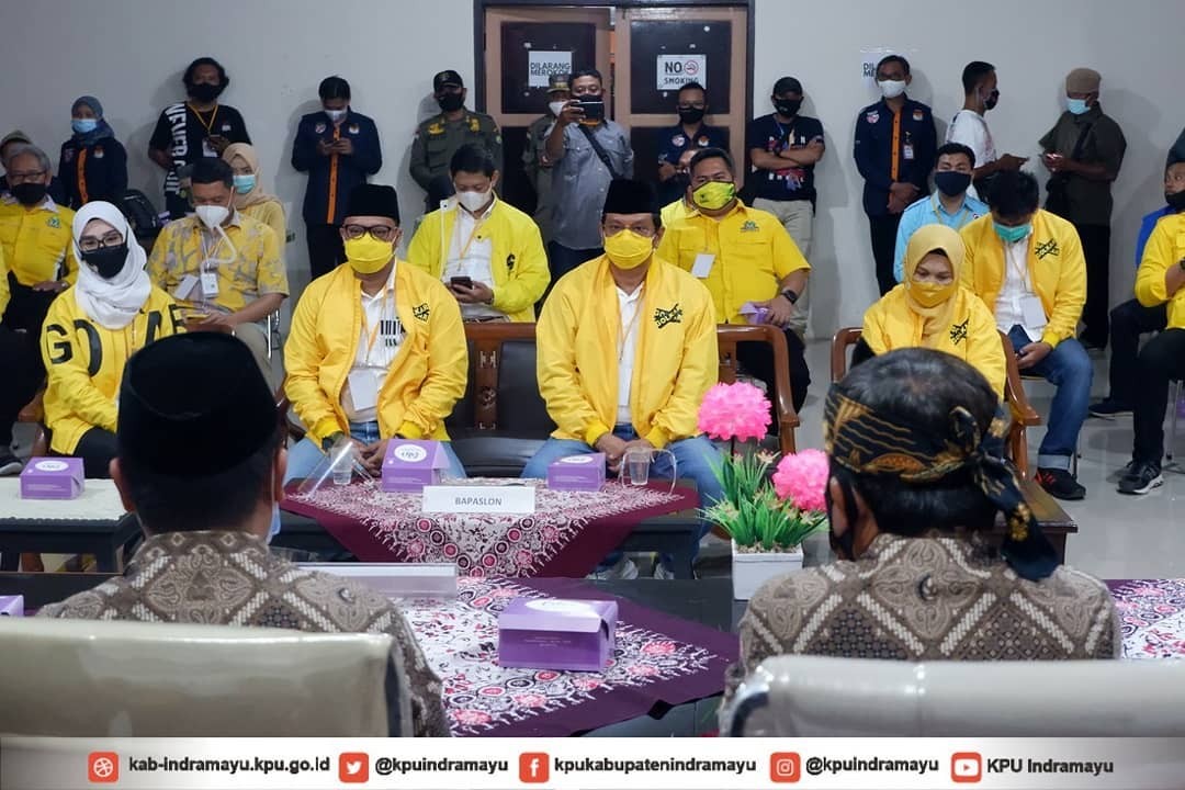Setelah penyerahan berkas pendaftaran, KPU Indramayu mengecek dokumen persyaratan calon dan persyaratan calon. Pasangan tersebut mendaftar dengan partai pengusung dari Golkar, karena berdasarkan hasil Pemilu tahun 2019 partai Golkar telah mendapat 22 (dua puluh dua) kursi pada DPRD Kabupaten Indramayu.