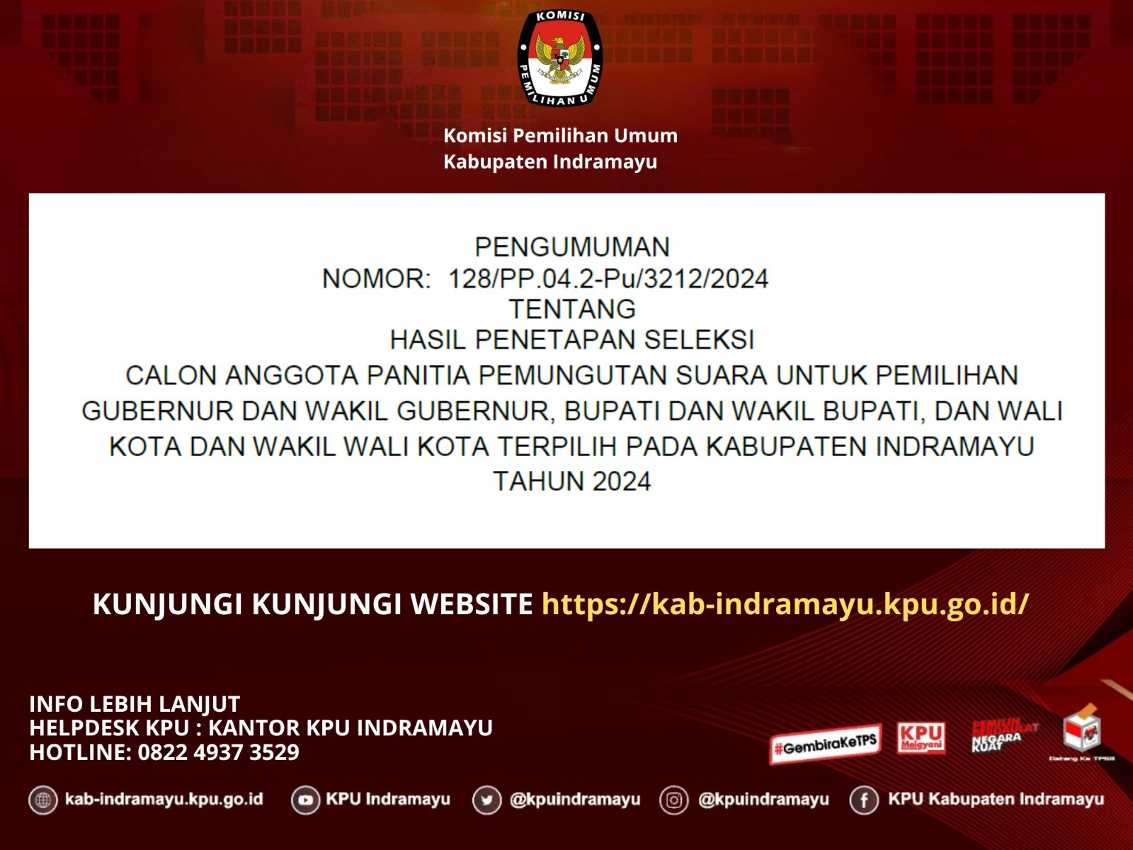 PENGUMUMAN NOMOR: 128/PP.04.2-Pu/3212/2024 TENTANG HASIL PENETAPAN SELEKSI CALON ANGGOTA PANITIA PEMUNGUTAN SUARA UNTUK PEMILIHAN GUBERNUR DAN WAKIL GUBERNUR, BUPATI DAN WAKIL BUPATI, DAN WALI KOTA DAN WAKIL WALI KOTA TERPILIH PADA KABUPATEN INDRAMAYU TAHUN 2024.