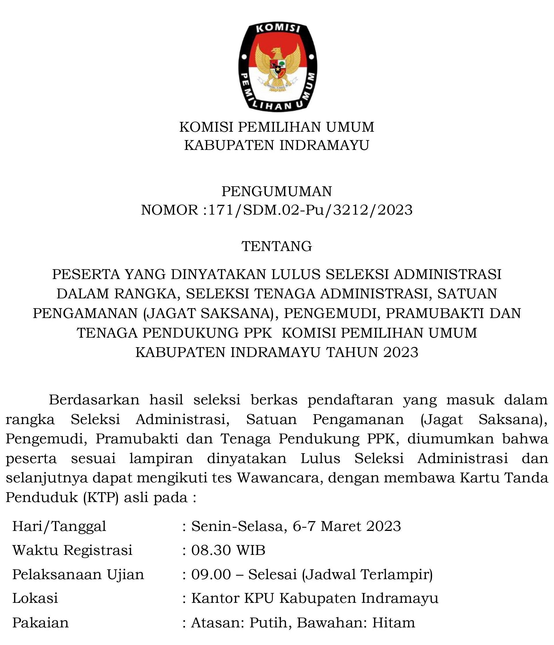 Hasil Seleksi Administrasi Tenaga Administrasi, Satuan Pengamanan (Jagat Saksana), Pengemudi, Pramubakti Dan Tenaga Pendukung PPK KPU Indramayu Tahun 2023