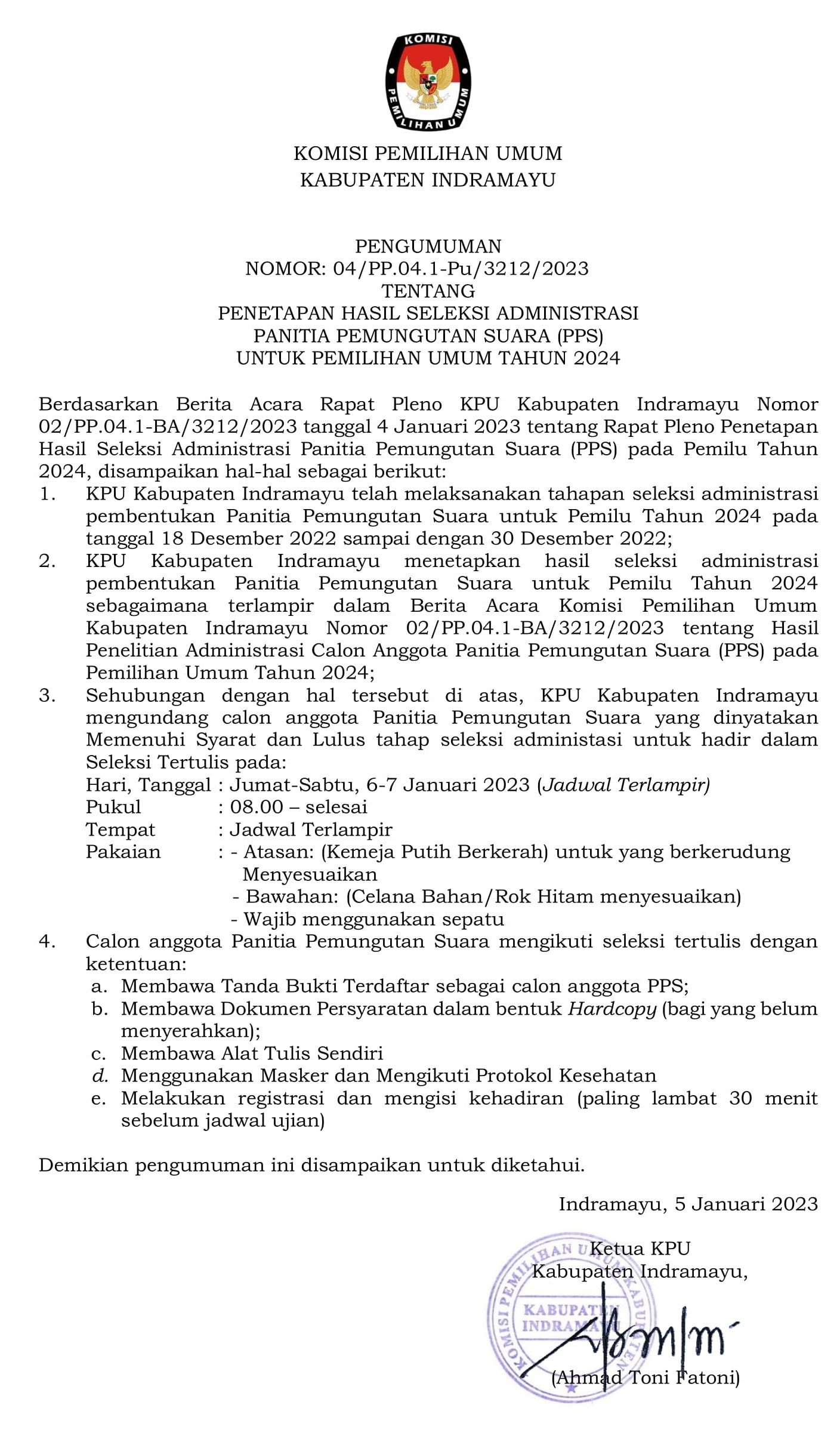 JADWAL CAT Calon Anggota PPS pada Pemilu Tahun 2024 Kabupaten Indramayu