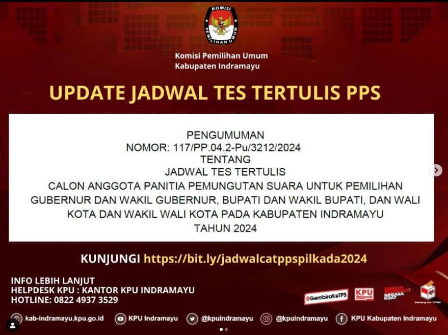 JADWAL TES TERTULIS CALON ANGGOTA PANITIA PEMUNGUTAN SUARA UNTUK PEMILIHAN GUBERNUR DAN WAKIL GUBERNUR, BUPATI DAN WAKIL BUPATI, DAN WALI KOTA DAN WAKIL WALI KOTA PADA KABUPATEN INDRAMAYU TAHUN 2024 Selasa, 14 Mei 2024 10:00 1741 UNDUH PENGUMUMAN SELENGKAPNYA DI SINI Bagikan: Dilihat 1,741 Kali.