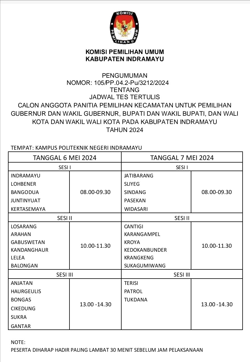 Jadwal Ujian Tulis Calon Anggota PPK Pilkada 2024 Kab. Indramayu