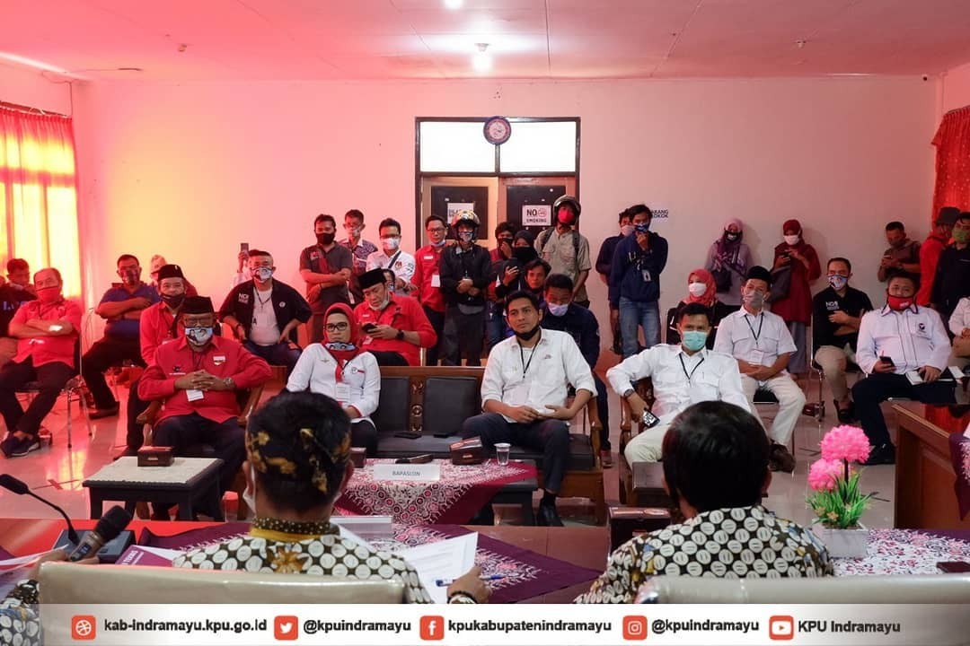 Komisi Pemilihan Umum (KPU) Indramayu pada hari pertama pendaftaran pasangan calon bupati dan wakil bupati Indramayu tahun 2020 menerima pasangan calon Nina Agustina dan Lucky Hakim yang mendaftar sebagai bupati dan wakil bupati Indramayu di Aula KPU Indramayu, Jum’at (4/9/2020). Pendaftran tersebut turut dihadiri Komisioner KPU Indramayu, Komisioner KPU Jawa Barat Endun Abdul Haq, Bawaslu Indramayu, dan Forkopimda.