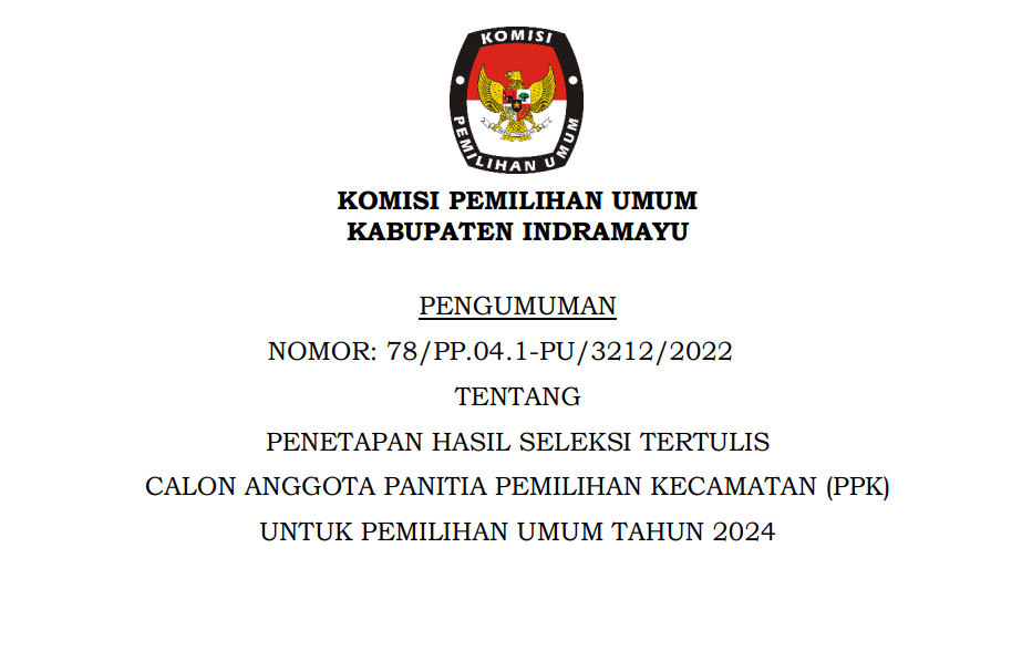 Berdasarkan Berita Acara Rapat Pleno KPU Kabupaten Indramayu Nomor 77/PP.04.1-BA/3212/2022 tanggal 8 Desember 2022 tentang Hasil Seleksi Tertulis Calon Anggota Panitia Pemilihan Kecamatan (PPK) untuk Pemilu Tahun 2024, KPU Kabupaten Indramayu telah melaksanakan tahapan seleksi tertulis calon Anggota PPK untuk Pemilu Tahun 2024 pada 6-7 Desember 2022, dan menetapkan hasil seleksi tertulis calon Anggota Panitia Pemilihan Kecamatan (PPK) untuk Pemilu Tahun 2024 sebagaimana terlampir pada link berikut ini :