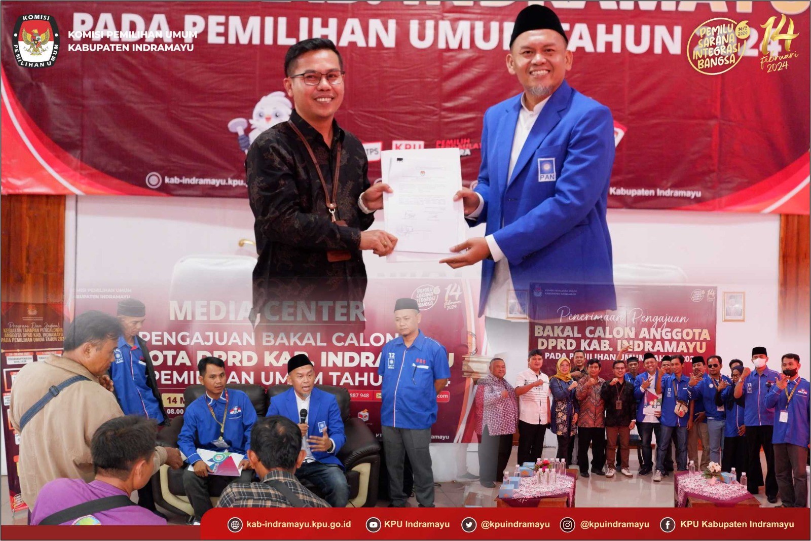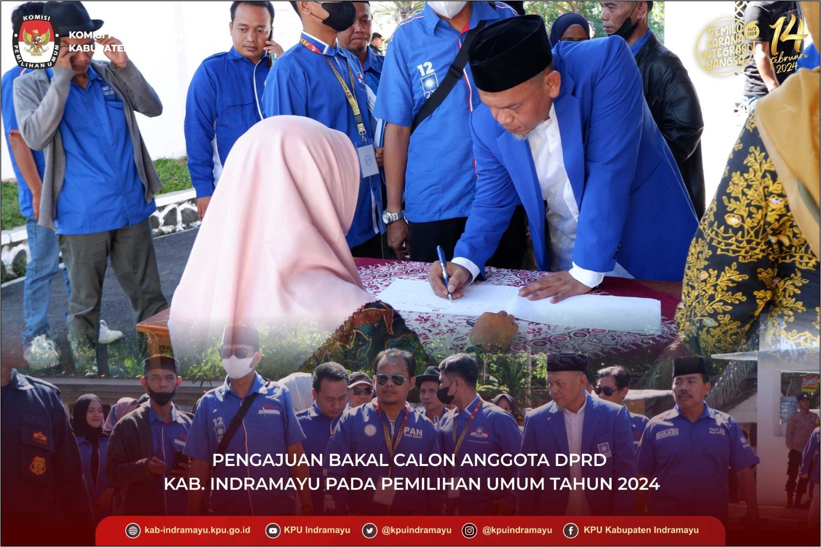 Jumat, 12 Mei 2023 Komisi Pemilihan Umum Kabupaten Indramayu menerima Pengajuan Bakal Calon Anggota DPRD Kabupaten Indramayu dari Partai Amanat Nasional Kabupaten Indramayu. Pengajuan tersebut diserahkan langsung oleh Ketua DPD Partai Amanat Nasional Kabupaten Indramayu, Dedi Aryanto yang diterima oleh Ketua KPU Kabupaten Indramayu Ahmad Toni Fatoni untuk dilakukan pengecekan kelengkapan persyaratan. Setelah dilakukan pengecekan persyaratan, Pengajuan Bakal Calon Anggota DPRD Kabupaten Indramayu dari Partai Amanat Nasional dinyatakan Lengkap dan Diterima untuk selanjutnya akan dilakukan tahap Verifikasi Administrasi yang dilaksanakan dari tanggal 15 Mei 2023 sampai 23 Juni 2023 (Peraturan KPU Nomor 10 Tahun 2023)