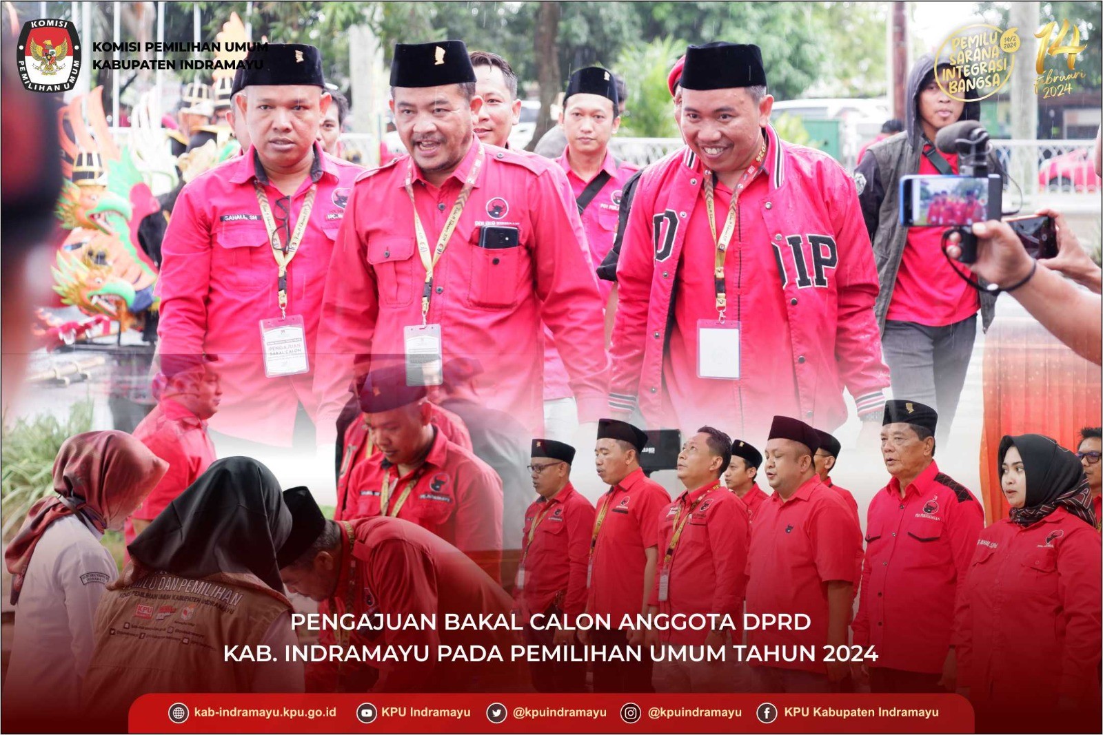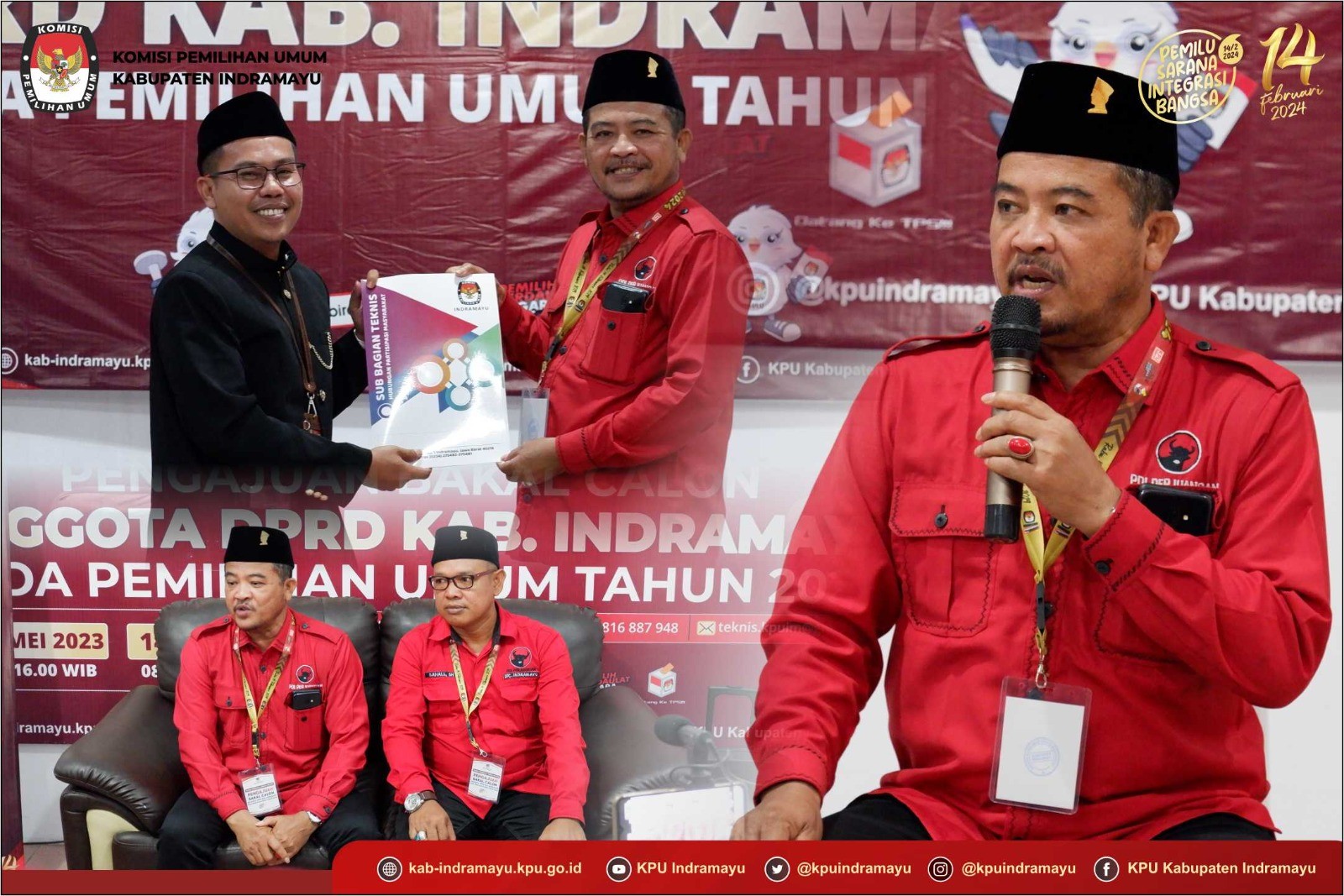 Kamis, 11 Mei 2023 Komisi Pemilihan Umum Kabupaten Indramayu menerima Pengajuan Bakal Calon Anggota DPRD Kabupaten Indramayu dari Partai Demokrasi Indonesia Perjuangan Kabupaten Indramayu. Pengajuan tersebut diserahkan langsung oleh Ketua DPC Partai Demokrasi Indonesia Perjuangan Kabupaten Indramayu, Sirojudin yang diterima oleh Ketua KPU Kabupaten Indramayu Ahmad Toni Fatoni untuk dilakukan pengecekan kelengkapan persyaratan. Setelah dilakukan pengecekan persyaratan, Pengajuan Bakal Calon Anggota DPRD Kabupaten Indramayu dari Partai Demokrasi Indonesia Perjuangan dinyatakan Lengkap dan Diterima untuk selanjutnya akan dilakukan tahap Verifikasi Administrasi yang dilaksanakan dari tanggal 15 Mei 2023 sampai 23 Juni 2023 (Peraturan KPU Nomor 10 Tahun 2023)