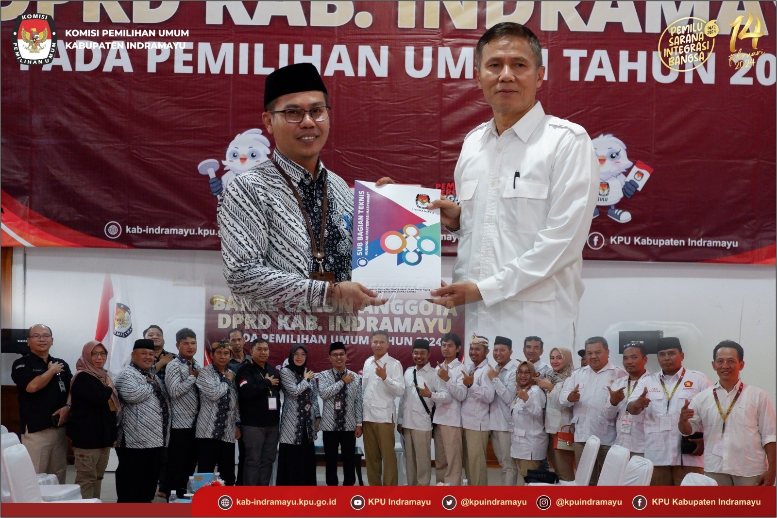 Minggu, 14 Mei 2023 Komisi Pemilihan Umum Kabupaten Indramayu menerima Pengajuan Bakal Calon Anggota DPRD Kabupaten Indramayu dari Partai Gerakan Indonesia Raya Kabupaten Indramayu. Pengajuan tersebut diserahkan langsung oleh Ketua DPC Partai Gerakan Indonesia Raya Kabupaten Indramayu, H Kasan Basari yang diterima oleh Ketua KPU Kabupaten Indramayu Ahmad Toni Fatoni untuk dilakukan pengecekan kelengkapan persyaratan. Setelah dilakukan pengecekan persyaratan, Pengajuan Bakal Calon Anggota DPRD Kabupaten Indramayu dari Partai Gerakan Indonesia Raya dinyatakan Lengkap dan Diterima untuk selanjutnya akan dilakukan tahap Verifikasi Administrasi yang dilaksanakan dari tanggal 15 Mei 2023 sampai 23 Juni 2023 (Peraturan KPU Nomor 10 Tahun 2023)