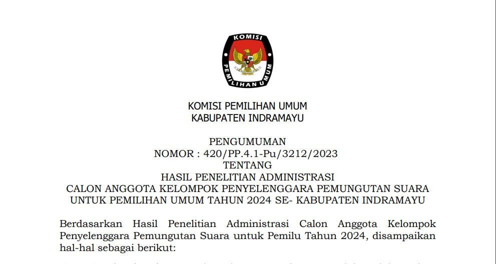 Dalam rangka pembentukan Kelompok Penyelenggara Pemungutan Suara / KPPS untuk Pemilihan Umum Tahun 2024, Komisi Pemilihan Umum Kabupaten Indramayu menerbitkan Pengumuman Nomor 420/PP.4.1-Pu/3212/2023 tentang Hasil Penelitian Administrasi Calon Anggota Kelompok Penyelenggara Pemungutan Suara Untuk Pemilihan Umum Tahun 2024 Se- Kabupaten Indramayu