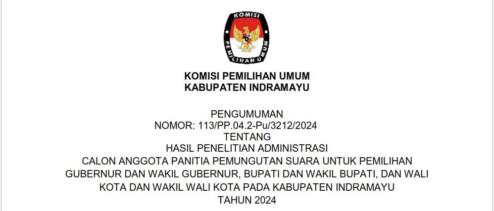 Sehubungan dengan Komisi Pemilihan Umum Kabupaten Indramayu telah melaksanakan tahapan Penelitian Administrasi Calon Anggota Panitia Pemungutan Suara pada untuk Pemilihan Gubernur dan Wakil Gubernur, Bupati dan Wakil Bupati, dan Wali Kota dan Wakil Wali Kota Tahun 2024, disampaikan beberapa hal sebagai berikut: