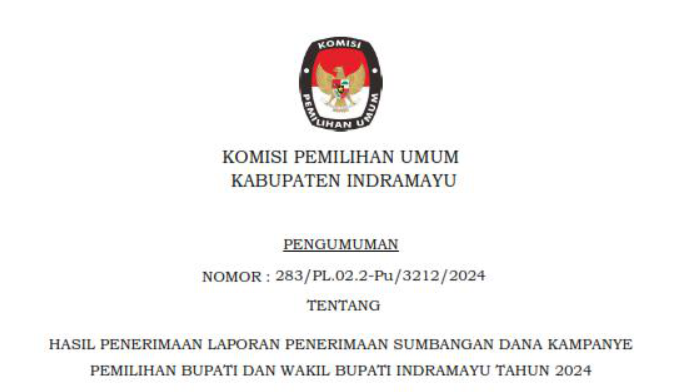 Pengumuman Hasil Penyampaian Laporan Penerimaan dan Pengeluaran Dana Kampanye (LPPDK) dari Masing-masing Pasangan Calon Bupati dan Wakil Bupati Indramayu Tahun 2024 >> Pengumuman