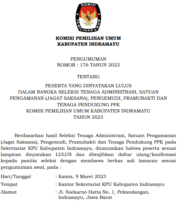 Pengumuman Hasil Seleksi Tenaga Administrasi, Satuan Pengamanan (Jagat Saksana), dan Tenaga Penduduk PPK
