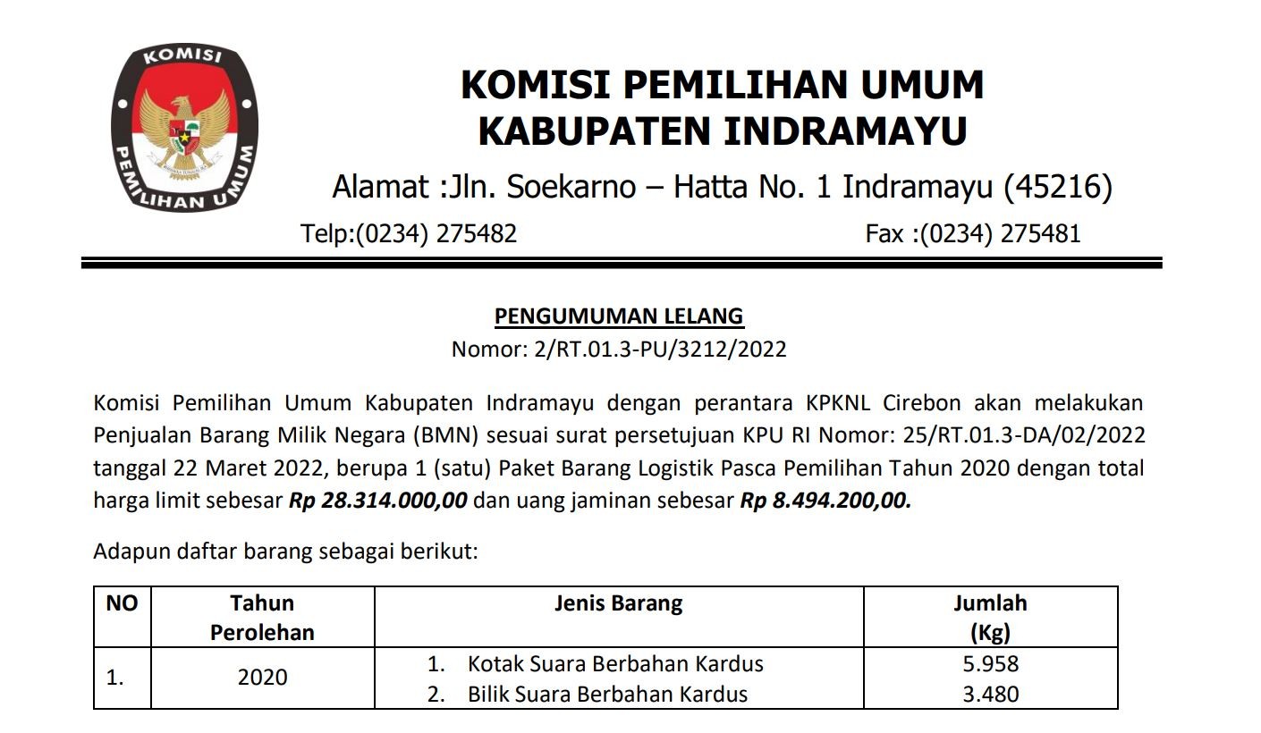 Komisi Pemilihan Umum Kabupaten Indramayu dengan Perantara KPKNL Cirebon akan melakukan penjualan Barang Milik Negara (BMN) sesuai surat persetujuan KPU RI Nomor: 25/RT.01.3-DA/02/2022 tanggal 22 Maret 2022, berupa 1 (satu) Paket Barang Logistik Pasca Pemilihan Tahun 2020.