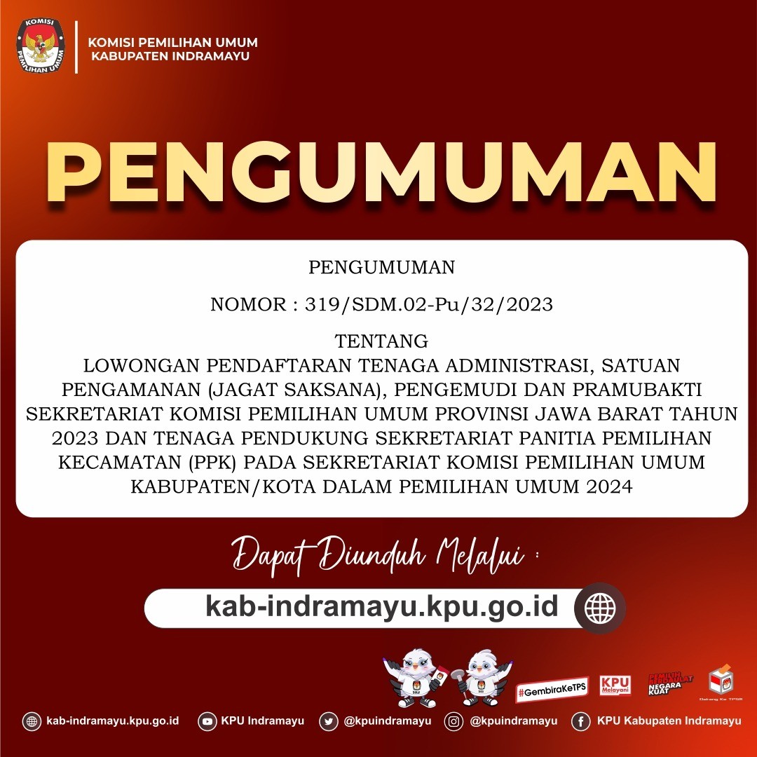 Pengumuman KPU Provinsi Jawa Barat Nomor 319/SDM.02-Pu/32/2023 tentang Lowongan Pendaftaran Tenaga Administrasi, Satuan Pengamanan (Jagat Saksana), Pengemudi, dan Pramubakti Sekretariat Komisi Pemilihan Umum Provinsi Jawa Barat Tahun 2023 dan Tenaga Pendukung Sekretariat Panitia Pemilihan Kecamatan (PPK) Pada Sekretariat Komisi Pemilihan Umum Kabupaten/Kota Dalam Pemilihan Umum 2024 dan Komisi Pemilihan Umum Kabupaten/Kota se-Jawa Barat Tahun 2023 .