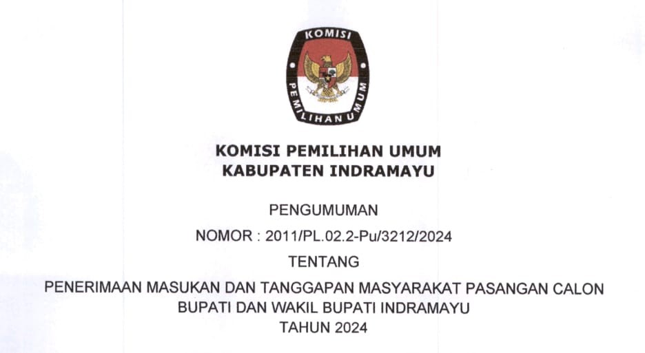 Bahwa untuk melaksanakan ketentuan Pasal 137 Peraturan KPU Nomor 8 Tahun 2024 tentang Pencalonan Gubernur dan Wakil Gubernur, Bupati dan Wakil Bupati, serta Walikota dan Wakil Walikota yang telah diubah dengan Peraturan KPU Nomor 10 Tahun 2024 tentang Perubahan Atas Peraturan KPU Nomor 8 Tahun 2024 tentang Pencalonan Gubernur dan Wakil Gubernur, Bupati dan Wakil Bupati, serta Walikota dan Wakil Walikota, Komisi Pemilihan Umum Kabupaten Indramayu mengumumkan Penerimaan Masukan dan Tanggapan Masyarakat terhadap Pasangan Calon Bupati dan Wakil Bupati Indramayu pada tautan sebagai berikut: