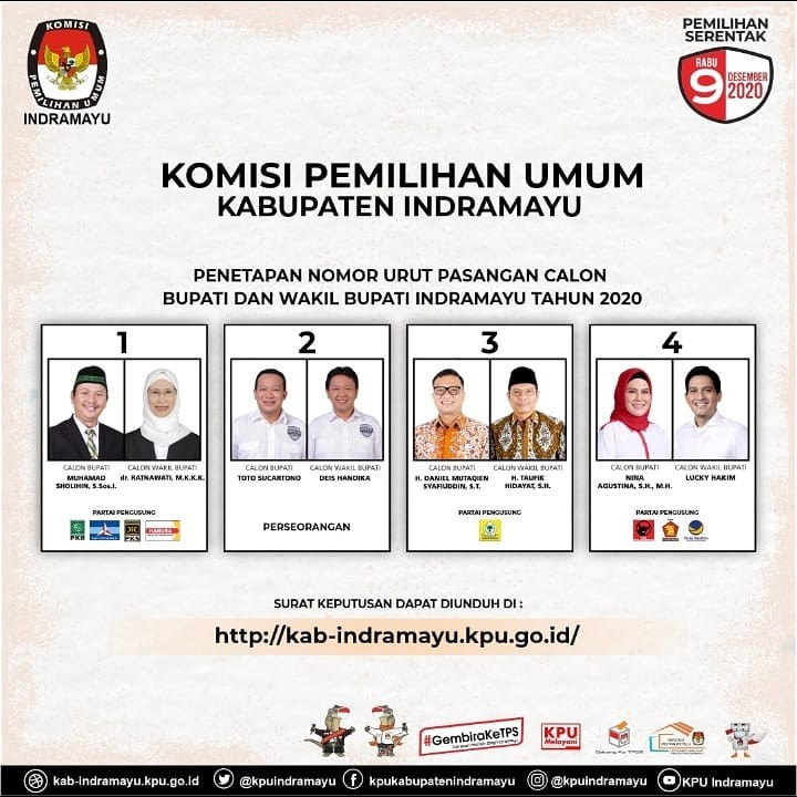Komisi Pemilihan Umum Kabupaten Indramayu selenggarakan proses Pengundian Nomor Urut bagi Pasangan Calon Bupati dan Wakil Bupati Indramayu pada Kamis, 24 September 2020 di Aula Gedung PGRI Sindang – Indramayu. Proses acara tersebut dihadiri oleh Pangsangan Calon, 2 orang perwakilan Bawaslu Kabupaten Indramayu, 1 orang Narahubung Pasangan Calon, dan Anggota KPU Kabupaten Indramayu.
