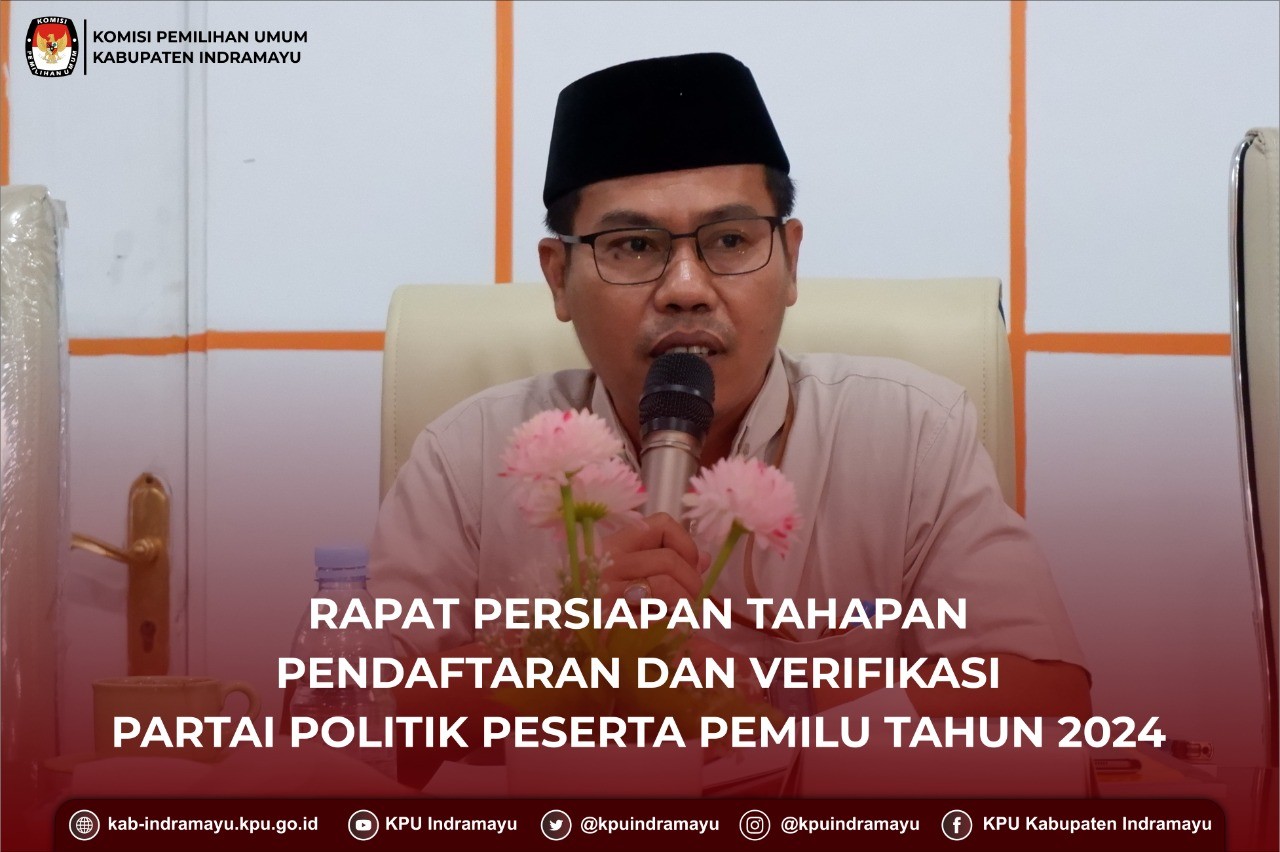 KPU Kabupaten Indramayu melaksanakan Rapat Kerja terkait Persiapan Tahapan Pendaftaran dan Verifikasi Peserta Pemilu Tahun 2024, di Aula KPU Kabupaten Indramayu, Kamis 28/7/2022. Kegiatan Rapat Kerja ini dihadiri oleh Ketua dan Anggota KPU Kabupaten Indramayu, Sekretaris, Kasubbag dan seluruh staf di lingkungan Sekretariat KPU Kabupaten Indramayu. Turut hadir pula Kasat Intelkam mewakili Polres Kabupaten Indramayu, AKP Yuda Megantara beserta jajaran.