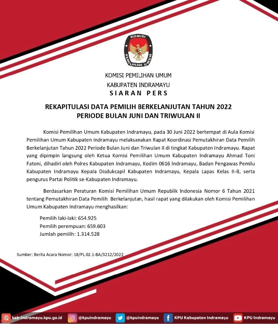 Komisi Pemilihan Umum Kabupaten Indramayu mengadakan Rapat Koordinasi Rekapitulasi Pemutakhiran Data Pemilih Berkelanjutan Tahun 2022 Periode Bulan Juni dan Triwulan II Tahun 2022.