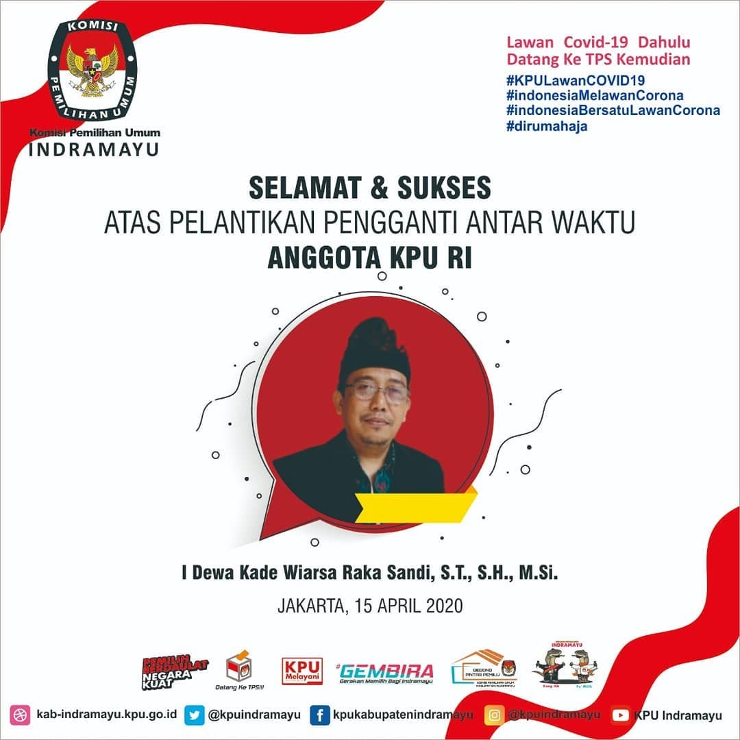 Selamat atas pengangkatan pengganti antar waktu anggota KPU RI 2017-2022, I Dewa Kade Wiarsa Raka Sandi, S.T., S.H., M.Si., yang telah dilantik oleh Presiden Joko Widodo, Rabu (15/4/2020) di Istana Negara, Jakarta. Selamat dan semoga sukses.