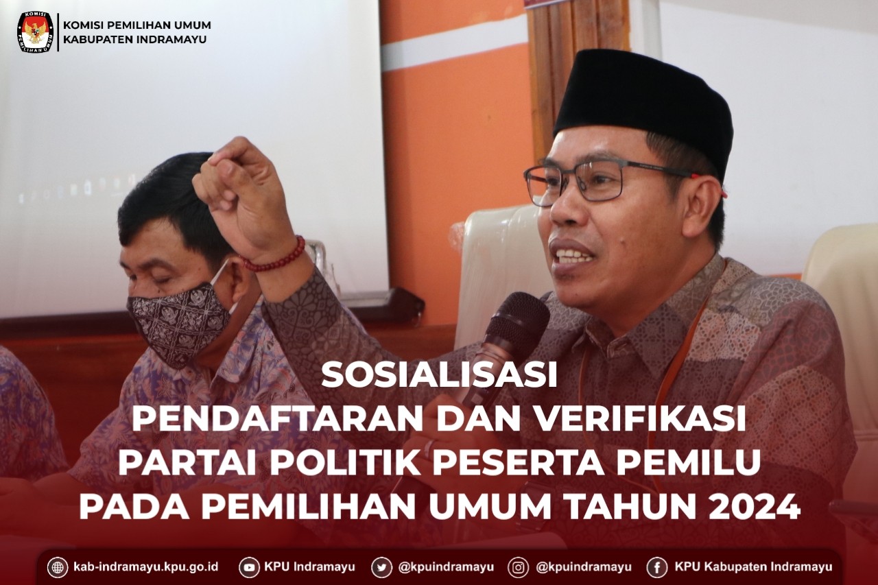 Jumat, 29 Juli 2022 bertempat di Aula Komisi Pemilihan Umum Kabupaten Indramayu, telah dilaksanakan Sosialisasi Pendaftaran dan Verifikasi Partai Politik Peserta Pemilu Pada Pemilihan Umum Tahun 2024. Kegiatan Sosialisasi dibuka langsung oleh Ketua Komisi Pemilihan Umum Kabupaten Indramayu Ahmad Toni Fatoni. Dalam sambutannya, Ia menekankan Komisi Pemilihan Umum Kabupaten Indramayu sebagai representasi Komisi Pemilihan Umum Republik Indonesia siap melaksanakan Verifikasi Administrasi sebagai salah satu tahapan pelaksanaan menuju tanggal 14 Februari 2024.